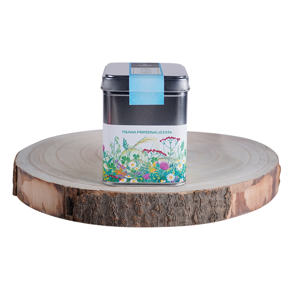 Caja de hojalata: Material: metal para contacto con alimentos Color: Plateado (metalizado) Tamaño: 75 x 75 x 95 mm Superficie: Pulida Bordes: ligeramente redondeados Etiqueta: impresión a cuatro colores Té, Té de Hierbas o Infusión a granel: Peso de llenado: 100g Producción desde: 100 piezas